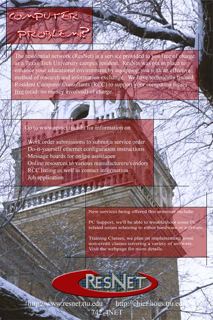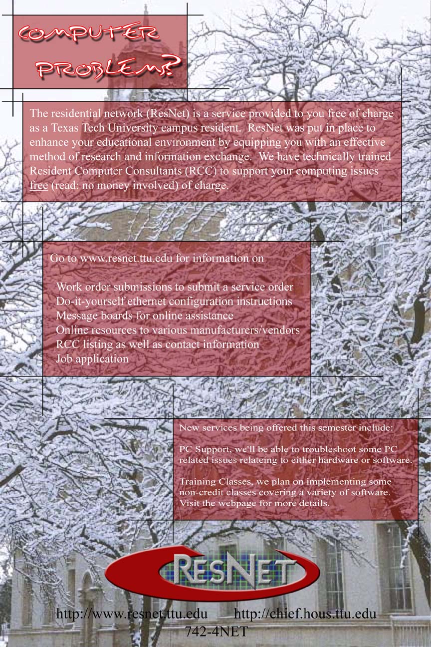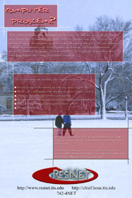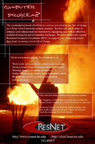 2001 – I started working at Texas Tech University in November 2000 and they wanted a new logo. The old was was basically a big R and beside it was es and et above and below each other where the R both represented the R in Res and N in Net. So I made this. This was my first real Photoshop project and was basically an exercise in layers. Nothing fancy. It got an overhaul by a colleague of mine and I may put that one up for comparison when I find it.